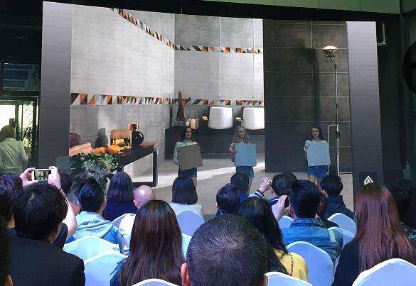 隨后,是最為精彩的新品展示環(huán)節(jié),充滿異域風情的模特手持馬可波羅瓷磚做現場展示,華耐家居集團瓷磚事業(yè)一部產品經理劉騰飛做現場解說。本場馬可波羅瓷磚新品發(fā)布會共展示了包括工業(yè)風系列和真石系列的共十數款產品。包括工業(yè)風SOHO石、珍妮紡、泰特石以及真石奧特曼、菲亞米黃、云多拉灰等,讓整個設計界為之眼前一亮。