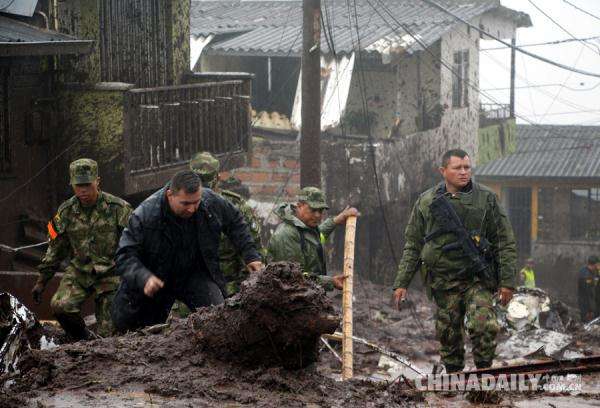 4月19日,在哥倫比亞中部卡爾達(dá)斯省馬尼薩萊斯市,警察和士兵在泥石流災(zāi)害發(fā)生地清理現(xiàn)場(chǎng)。