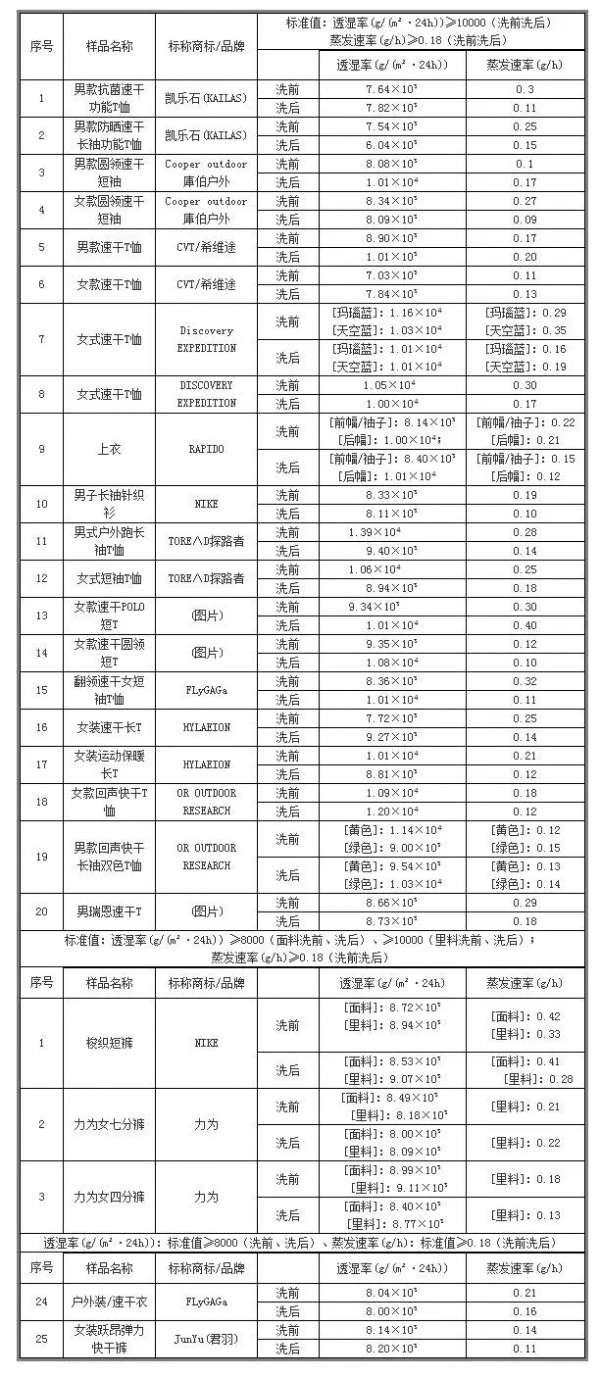 在不合格產(chǎn)品名單中,明示具有速干功能的30批次產(chǎn)品中,有20批次產(chǎn)品蒸發(fā)速率實測值低于標準要求。其中,“凱樂石(KAILAS)”兩款速干功能T恤、“Nike”一款男士長袖針織衫、“TOREAD探路者”兩款T恤等“榜上有名”;而在明示具有吸濕速干功能的產(chǎn)品中,“彪馬PUMA”“Onepolar極地”等品牌部分商品與標準值存在差異。