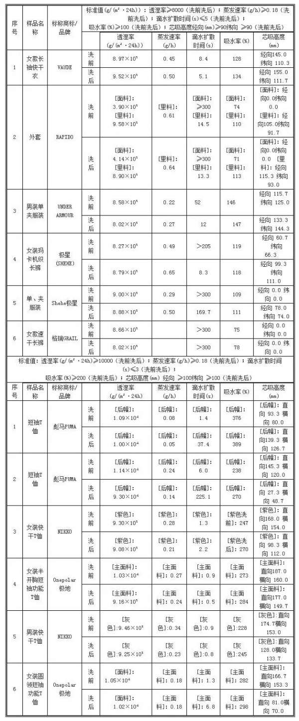 這次比較試驗中,有13批次樣品明示同時具有吸濕速干或類似功能。測試結果顯示,有6批次樣品速干功能指標達到要求,但吸濕功能指標滴水擴散時間和芯吸高度這兩項指標的實測值則未達到標準要求;兩個批次樣品吸濕功能指標達到了要求,但速干功能指標則為未達到指標要求,且均為透濕量實測值未達到標準要求;4批次樣品吸濕功能和速干功能均未達到指標要求。