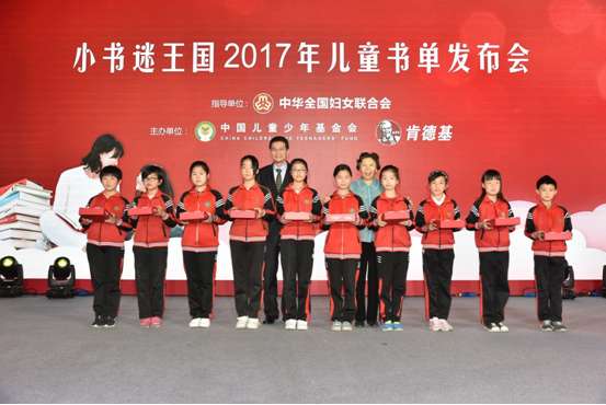 在啟動(dòng)儀式現(xiàn)場(chǎng),趙東花、朱錫生、黃進(jìn)栓,北京肯德基有限公司總經(jīng)理趙莉,以及兒童閱讀專(zhuān)家代表由兒童文學(xué)作家、教育學(xué)家、藝術(shù)家、科學(xué)家、心理學(xué)家、兒童圖書(shū)館館長(zhǎng)等專(zhuān)家組成的兒童閱讀顧問(wèn)團(tuán)共同發(fā)布“小書(shū)迷王國(guó)2017年兒童書(shū)單”,并向留守兒童“小候鳥(niǎo)“代表贈(zèng)書(shū)。