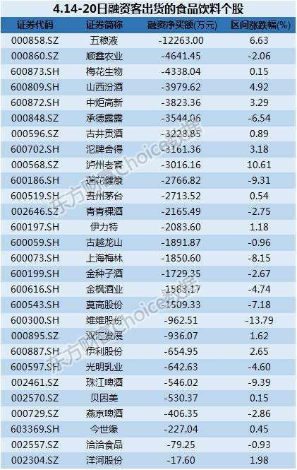 比如食品飲料行業(yè)中,凈賣出額靠前的絕大多數(shù)是白酒龍頭股,比如排名第一的五糧液,遭融資客凈賣出1.23億元;貴州茅臺遭融資客凈賣出2700萬元;順鑫農(nóng)業(yè)、山西汾酒、古井貢酒、沱牌舍得、瀘州老窖等多只白酒股也遭融資客凈賣出;