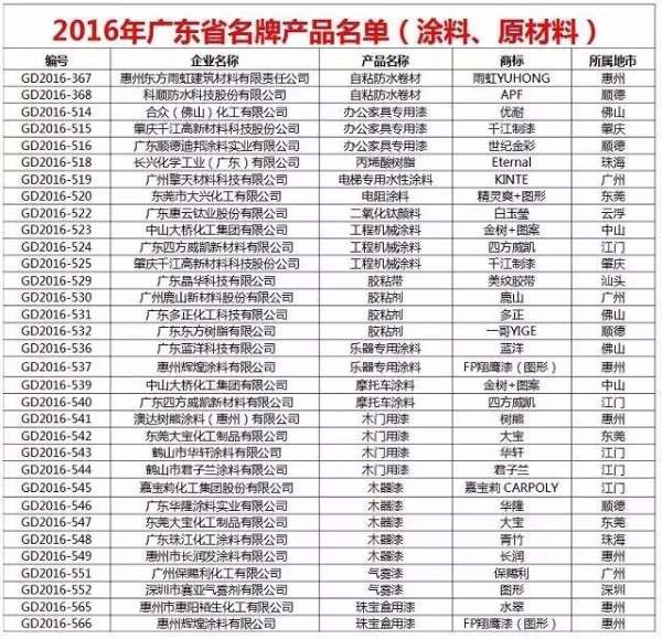 據(jù)了解,本次共有651個工業(yè)類產(chǎn)品、41個服務(wù)業(yè)類產(chǎn)品獲得了“2016年廣東省名牌產(chǎn)品”,其中涂料、原料類的產(chǎn)品有30多個,包括嘉寶莉、大寶、長潤發(fā)、君子蘭、華隆、東方雨虹、科順、優(yōu)耐、千江制漆、世紀(jì)金彩、金樹、四方威凱、一哥、藍(lán)洋、翔鷹漆、樹熊、華軒、青竹、水翠等。(如下圖)