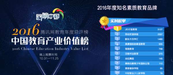 10月31日―11月25日,騰訊網(wǎng)“回響中國“教育年度總評(píng)榜投票工作正在盛大進(jìn)行中,源自韓國的JEI才能教育不僅成功入圍2016騰訊網(wǎng)教育年度總評(píng)榜,并且高居“2016年度知名素質(zhì)教育品牌榜”的榜首。