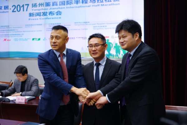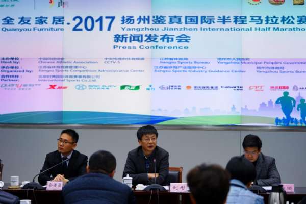 發(fā)布會上,揚(yáng)州市體育局局長佘俊臣代表組委會介紹了2017揚(yáng)州鑒真國際半程馬拉松賽的總體安排及賽事亮點(diǎn)。本次大賽獨(dú)家冠名商全友家居代表致辭,現(xiàn)場舉行了贊助商簽約和授牌儀式。