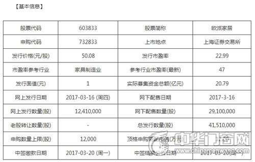 【中華門窗網(wǎng)】22日,歐派家居集團股份有限公司(股票簡稱為“歐派家居”,股票代碼為“603833”)發(fā)布晚間公告。公告顯示,歐派家居首次公開發(fā)行不超過4,151萬股人民幣普通股(A股)的申請已獲中國證券監(jiān)督管理委員會證監(jiān)許可。據(jù)了解,本次股票發(fā)行價格為50.08元/股,發(fā)行數(shù)量為4,151萬股,全部為新股發(fā)行,無老股轉(zhuǎn)讓。