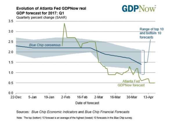 本周五將公布美國的一季度GDP初讀,市場結(jié)合近期“軟性數(shù)據(jù)”利好和“硬性數(shù)據(jù)”不佳的趨勢,認(rèn)為一季度GDP增速或不及預(yù)期。一向被認(rèn)為同官方數(shù)據(jù)更為貼近的亞特蘭大聯(lián)儲“GDPNow”模型預(yù)計,美國今年一季度的GDP增速僅為0.5%。