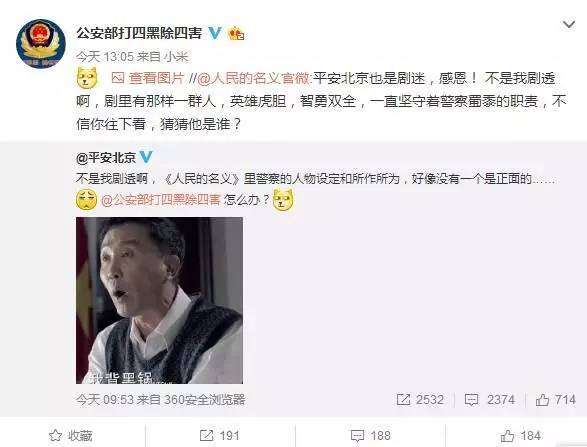 早在這劇開播沒多久的時候,北京市公安局官方微博號@平安北京就在向公安部“哭訴”,《人民的名義》里的警察好像沒有一個是正面的……