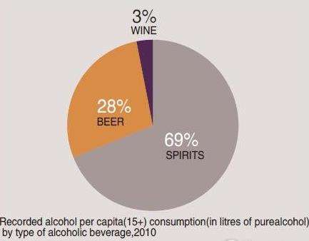世界衛(wèi)生組織2010年《全球酒精與健康狀況報(bào)告》顯示,中國的酒類消費(fèi)中,烈性酒類占酒精消費(fèi)的69%,啤酒類占28%,紅酒類3%。