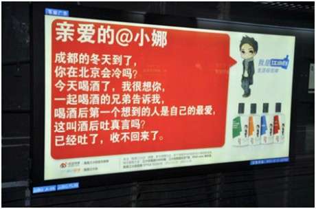 在微博上,江小白善用文案煽情營銷。“親愛的@小娜:成都的冬天到了,你在北京會(huì)冷嗎?今天喝酒了,我很想你,一起喝酒的兄弟告訴我,喝酒后第一個(gè)想到的人是自己的最愛,這叫酒后吐真言嗎?已經(jīng)吐了,收不回來了”。