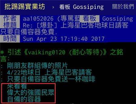 有臺(tái)灣網(wǎng)友在PTT上發(fā)帖:“來看看偉大的強(qiáng)國(guó)民眾自備的容器”。