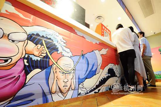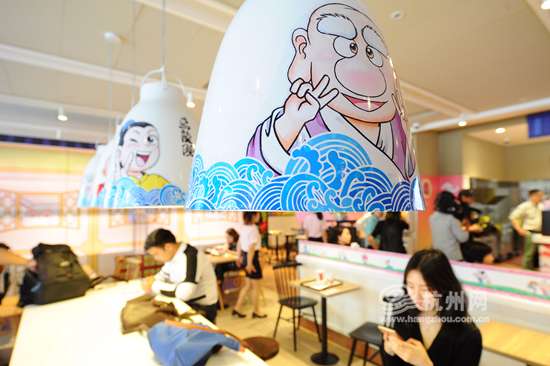 “餐廳一整面風(fēng)景玻璃都是半透明的烏龍?jiān)郝媹?chǎng)景,從外面看,餐廳里的人就好像真實(shí)的生活在烏龍?jiān)豪镆粯樱@種感覺真的太棒了!”這位90后的國(guó)漫迷王睿看起來(lái)竟有點(diǎn)激動(dòng),“我小學(xué)的時(shí)候就愛看《烏龍?jiān)骸罚锩婺莻(gè)大師兄最搞笑了,是我童年的最大樂趣!”