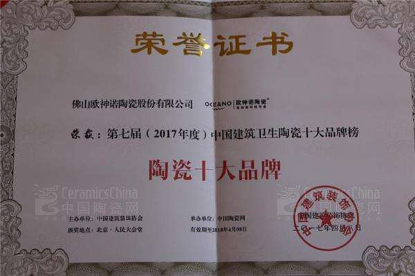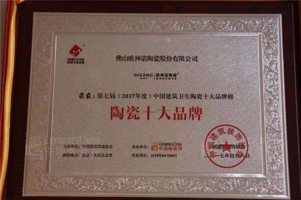 \u00A0 \u00A0 歐神諾陶瓷作為“陶瓷十大品牌”的參評企業(yè),經過熱度高企的網絡投票和專家評審團的嚴格審核,最終高票問鼎行業(yè)最高榮譽“2017陶瓷十大品牌”。歐神諾陶瓷負責人受大會邀請出席本次盛典,并上臺接受頒獎儀式,一同入選“2017陶瓷十大品牌”的企業(yè)品牌還包括馬可波羅瓷磚、東鵬瓷磚、強輝陶瓷、百特陶瓷、能強陶瓷、金舵瓷磚、冠星王陶瓷、獅王陶瓷、金尊玉大理石瓷磚。