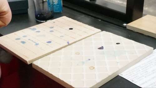冠軍磁磚(右)與其他品牌瓷磚(左)滲墨情況對(duì)比