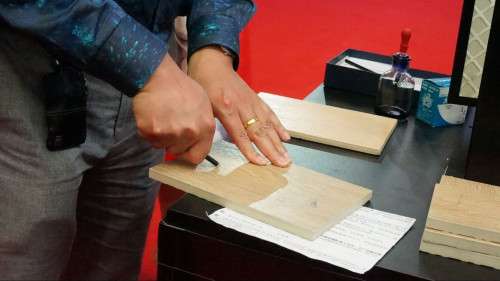 現(xiàn)場(chǎng)客戶對(duì)冠軍磁磚進(jìn)行硬度檢測(cè)