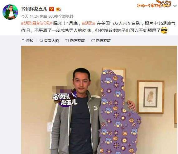 5月2日下午,“名偵探趙五兒”在微博曬出胡歌4月底在美國(guó)的近照,寫(xiě)道:“曝光!4月底,#胡歌#在美國(guó)與友人親切合影,照片中老胡帥氣依舊,還平添了一絲成熟男人的韻味,各位粉絲老妹子們可以開(kāi)始舔屏了。”