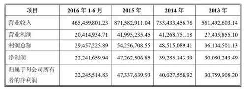 招股書顯示,金牌廚柜2016年1-6月營(yíng)業(yè)收入為4.65億元,凈利潤(rùn)為2224萬元。2013年-2016年?duì)I收分別為5.61億元、7.33億元、8.72億元;凈利潤(rùn)分別為3008萬、3929萬、4726萬。