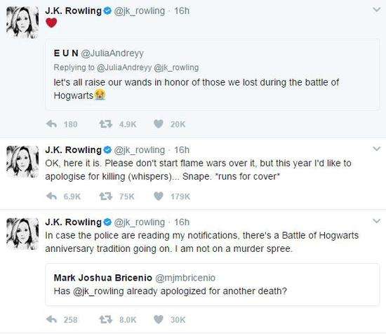 她先是轉(zhuǎn)發(fā)一位網(wǎng)友的疑問“J·K·羅琳今年有向死者道歉嗎?”,幽默回應“以防萬一有警察在看,我先說清楚這是紀念霍格沃茨之戰(zhàn)的傳統(tǒng),我不是殺人狂。”然后她再發(fā)一條推:“今年我為殺死了(小聲說)……斯內(nèi)普而道歉”。