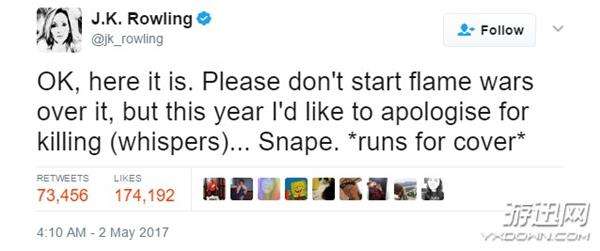 \u00A0 \u00A0“好吧,這就開(kāi)始。我不想引戰(zhàn),不過(guò)今年我想為(小聲說(shuō))。。。斯內(nèi)普的死而道歉。 *馬上躲起來(lái)*”