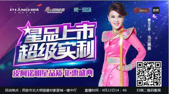 4月22日14:40,西安市北大明宮建材家居城一樓中廳,皮阿諾將邀請“蒙古族之花”烏蘭圖雅傾情獻(xiàn)唱,烏蘭圖雅敢于創(chuàng)新,無論是她的音樂還是她的個人形象,都十分講究在傳承與突破兩者之間探索嘗試,作為融合各種文化和風(fēng)格的皮阿諾櫥柜、衣柜正好符合這樣的定位。烏蘭圖雅為大家?guī)砭使?jié)目的同時分享居家生活的經(jīng)驗(yàn),為廣大市民挑選家居產(chǎn)品出謀劃策,為幸福生活助力,皮阿諾櫥柜、衣柜、家居定制五一放價、明星分享高品質(zhì)生活經(jīng)驗(yàn)、多重互動驚喜,只等廣大市民和粉絲前來體驗(yàn)。