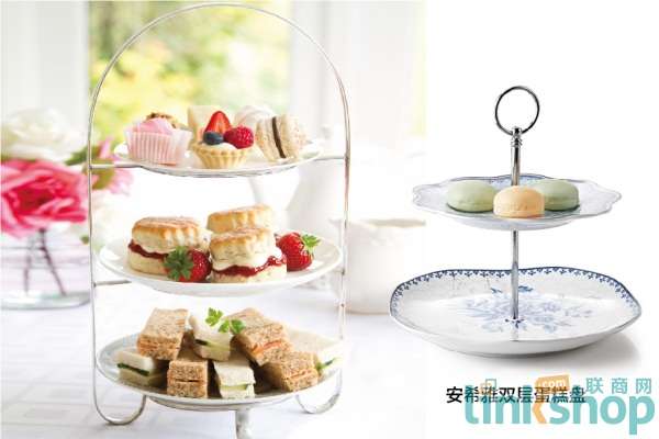 傳統(tǒng)三層塔的最下層是放置各式咸味三明治,第二層放泡芙、餅干或巧克力,最上層放蛋糕及水果塔。若在家要簡單點(diǎn),選擇一些喜愛的馬卡龍、曲奇,雙層蛋糕盤就很適用。
