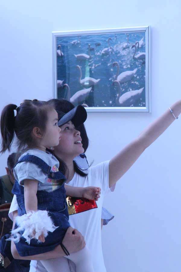 “小天鵝成長課堂”開始前家長和孩子一起看天鵝主題攝影展