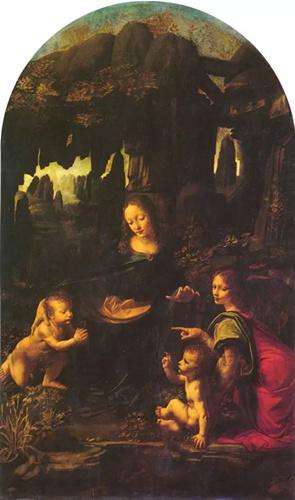 在這幅畫里,達芬奇第一次成功地探討了人與自然的融合。畫中既沒有寶座,也沒有建筑物的構(gòu)架,因而空間的參照完全是由一個巖穴來確定的。在這一巖穴上,畫家顯然花了極大的心血,一方面是讓其倒映在清澈的水中,另一方面讓在遠處的各種各樣的植物的葉子來裝點它,仿佛是從霧蒙蒙的金色陽光中顯出來的。