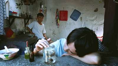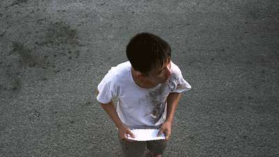 人摔倒了,但是手里依然舉著紅豆冰,衣服破了洞,手上流了血,終于把早已化成水的紅豆冰送到打架魚手里。沒有什么的多的話,只有三個字“給你的”。
