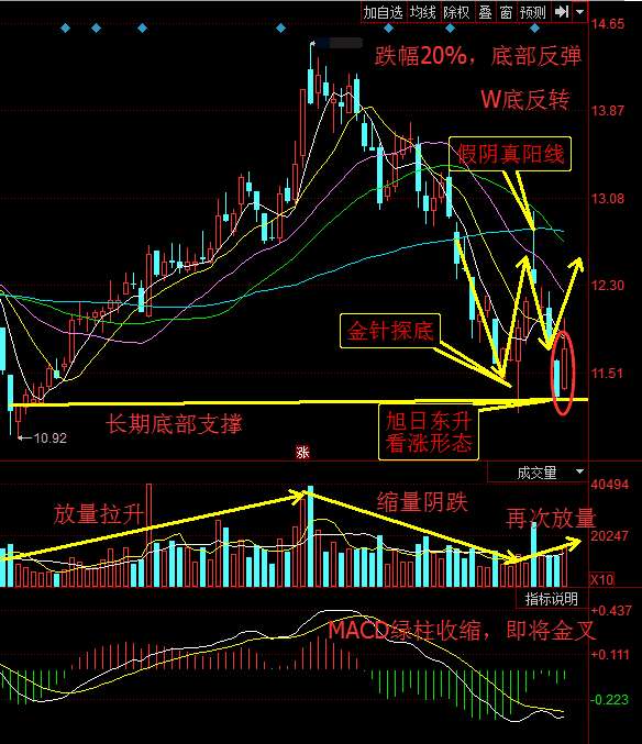該股屬于目前熱點概念股,前期在10.92元長期橫盤震蕩,形成底部。在這波行情中持續放量拉升,說明是主力主導,散戶跟風的上漲。之后因為大盤下挫,股價超跌20%到底部受到支撐,大量散戶和主力被套。而且形成明顯的W底反轉形態,其中有長下影大陽線,形成金針探底企穩K線,這是主力V型洗盤,向下打壓股價測試支撐強度,并清洗浮籌。之后形成假陰真陽線是主力盤中高開持續打壓股價,清洗套牢盤。現在股價形成旭日東升看漲K線,而且成交量再次放大,macd的綠柱即將翻紅并金叉,下方支撐明顯,上漲空間大,是難得的牛股。