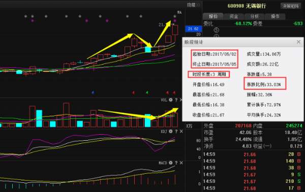 現在,我們在來看一下第二只利用“一步抓漲”選出的無錫銀行600908在5月2日當天講解,該股在快速突破5日線封板成功,從講解到現在連續斬獲3個強勢封漲停,短短3個交易日33個點的漲幅到手,截止到目前的漲幅達33.03%