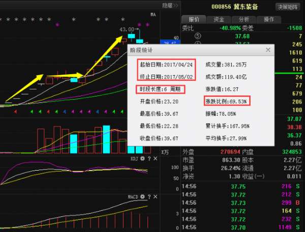 第一支牛股——本人用“一步抓漲”抓出的冀東裝備000856,該股是本人一直看好的龍頭股,屬于雄安概念。那么該股在4月24日本人講解,該股經過一個整體的橫盤調整,之后一個強勢的拉升,MACD處于金叉買入信號,近期的成交量也是放出了一個天價,在5月2日那天,再度利用戰法發文講解該股后期有風險把握!大家可以看一下這一波短短的6個交易日,漲幅高達69.53%