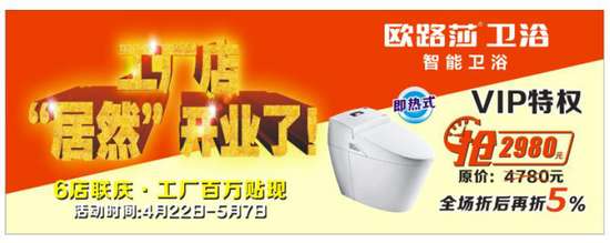 歐路莎衛(wèi)浴6店聯(lián)慶即將火熱開業(yè),裝修的準(zhǔn)業(yè)主朋友們,千萬(wàn)別錯(cuò)過(guò)難得的開業(yè)巨惠,早訂早劃算!