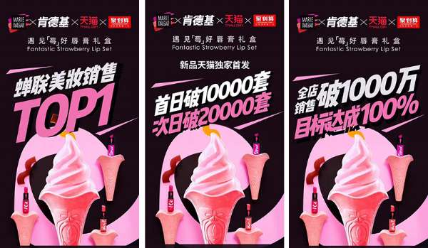 瑪麗黛佳×肯德基限量套盒開賣28分鐘就突破1萬套,次日突破2萬套。活動三天內(nèi),瑪麗黛佳天貓旗艦店銷售額高達1250萬,位列天貓美妝排名NO.1。限量首發(fā)當(dāng)天更是遠超天貓3.8大促首日銷售額,相較于2017年日均銷售額增長達593%,相當(dāng)于2016年5月全月銷售額的1.35倍。