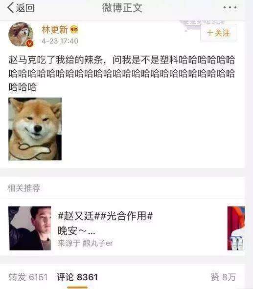 4月23日,林更新發(fā)微博分享了自己給好友趙又廷吃了辣條后的搞笑一幕,林更新笑得不能自已,可能他也沒(méi)想到趙又廷長(zhǎng)這么大竟然都沒(méi)有吃過(guò)辣條吧。趙又廷吃了林更新給他的辣條后,問(wèn)的第一句話(huà)是:是不是塑料。