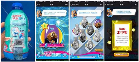 為了小朋友覺得喝水有趣,雀巢優(yōu)活兒童水還做了個(gè)H5養(yǎng)成游戲。撕開瓶身一側(cè),掃描露出的二維碼就能玩到。每賣一瓶?jī)和湍芩鸭活w水能量。四顆水能量激活一瓶虛擬的兒童水,并觸發(fā)抽獎(jiǎng)。獎(jiǎng)品都是《瘋狂動(dòng)物城》的周邊,比如筆記本、水瓶等等。