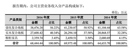 招股書顯示,菲林格爾主營業(yè)務劃分為強化復合地板、實木復合地板和櫥柜家具三類。2014-2016年,強化復合地板和實木復合地板合計收入分別為6.20億元、6.75億元、6.61億元,占同期主營業(yè)務收入的比例分別為95.86%、96.50%、96.56%,為公司營收的主要來源。