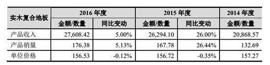 中國網(wǎng)財經(jīng)記者注意到,盡管強化復合地板和實木復合地板兩大業(yè)務占主營業(yè)務收入的比例不斷增長,但二者發(fā)展趨勢有所不同。招股書顯示,強化復合地板占主營業(yè)務收入的比例不斷下降,2014-2016年分別占比63.58%、58.92%、56.22%,收入金額也從2014年的4.11億元降至2016年的3.85億元。與此相反,實木復合地板占主營業(yè)務收入的比例不斷上升,2014-2016年占比分別為32.28%、37.58%、40.34%,收入金額從2014年的2.09億元增長到2016年的2.76億元。