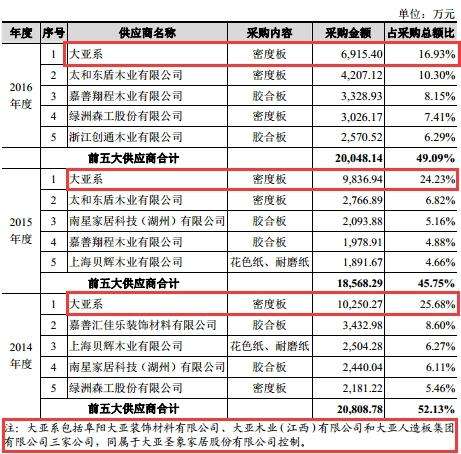 菲林格爾產(chǎn)品所需原材料主要包括密度板、耐磨紙、平衡紙、膠合板、表層木板。招股書顯示,2014-2016年菲林格爾最大原材料供應商為大亞系,供應原材料為密度板,報告期內(nèi),菲林格爾從大亞系采購金額占采購總額的比例分別為25.68%、24.23%、16.93%。中國網(wǎng)財經(jīng)記者注意到,大亞系包括阜陽大亞裝飾材料有限公司、大亞木業(yè)(江西)有限公司和大亞人造板集團有限公司三家公司,同屬于大亞圣象家居股份有限公司(簡稱“大亞圣象”)控制。