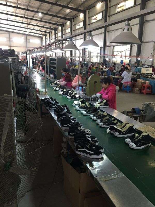 生產(chǎn)車間面積上千平方米,里面氣味刺鼻,數(shù)臺電風(fēng)扇正呼呼轉(zhuǎn)動(dòng),100多名工人十分忙碌:制作鞋底、印花、縫制鞋面、做鞋幫、固定鞋型、系鞋帶、裝盒……