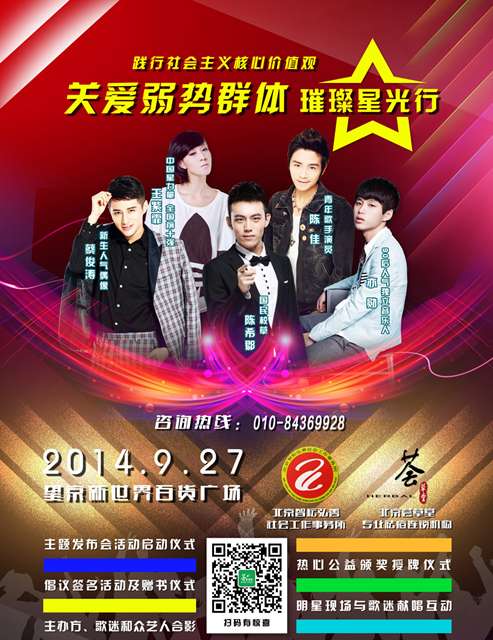\u00A0\u00A0\u00A0\u00A0在“頒獎授牌”環(huán)節(jié),望京新世界商場及北京薈草堂祛痘望京旗艦店分別獲得了“熱心公益優(yōu)秀企業(yè)”獎,以肯定其對公益事業(yè)所作出的貢獻。在“倡議簽名”環(huán)節(jié),陳?、蔡俊濤、亦勛等作為嘉賓邀請觀眾上臺,共同在“關(guān)注弱勢群體,參與義工活動”橫幅上簽名,為愛心活動集贊,呼吁更多人關(guān)注公益事業(yè)。以倡議更多的人參與到義工行動中。在“捐贈書籍”環(huán)節(jié),打工子弟學校學生代表上臺接受捐贈,并為陳?ぁ⒉炭、王紫菲等嘉賓佩戴紅領(lǐng)巾,而陳?、蔡俊濤也為學生們演唱了耳熟能詳?shù)膬焊。亦勛也獻上了《裝英雄》《矯情》等歌曲。在最后的“現(xiàn)場互動及合影”環(huán)節(jié),蔡俊濤將準備的禮物贈送給現(xiàn)場觀眾、并與在場的觀眾們一起合影留戀,而活動完后,蔡俊濤被當場的粉絲圍個水泄不通,引發(fā)騷動,最終在工作人員的護送下離開了現(xiàn)場。