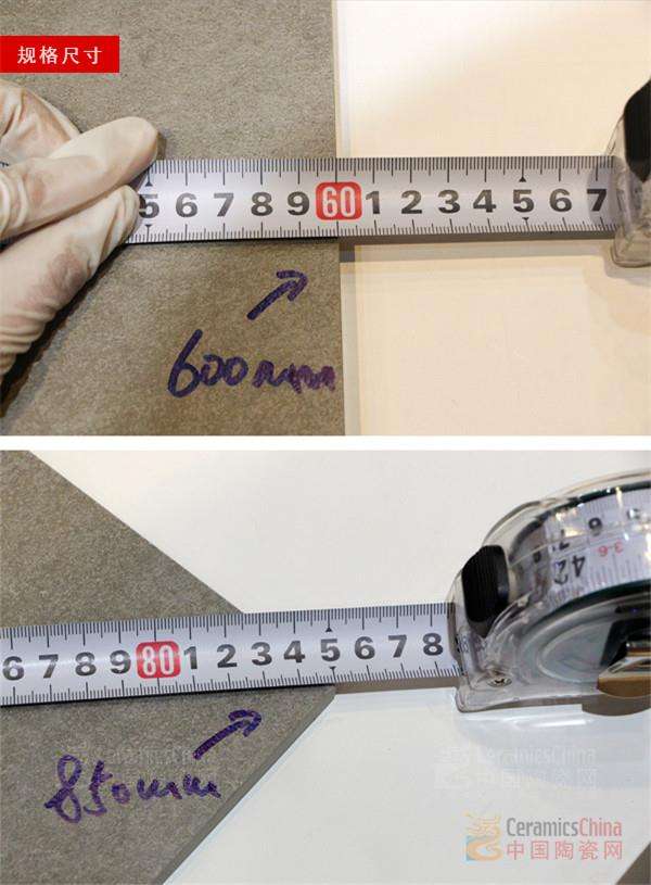 \u00A0 \u00A0 我們以標準卷尺為尺寸界定,測得凝灰印記系列規(guī)格為600mmX600mm、對角為850mm,做工與規(guī)格精準、分毫不差,可展露出歐美現(xiàn)代仿古磚,在生產(chǎn)研發(fā)上工藝嚴謹,尺寸規(guī)格把控一貫出色。因應(yīng)隨機抽取的測準性,亦可看出其生產(chǎn)質(zhì)量的上乘。