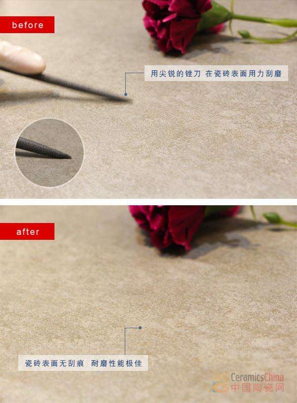 \u00A0 \u00A0 透過一把連金屬都可以磨平的尖銳銼刀,對歐美現(xiàn)代仿古磚來回用力刮磨數(shù)十次后,經(jīng)過細致的觀察與觸摸,我們發(fā)現(xiàn):瓷磚表面并未出現(xiàn)刮損痕跡,依舊光潔如新,莫氏硬度高達五級的顯著性能,由此尤為可見。