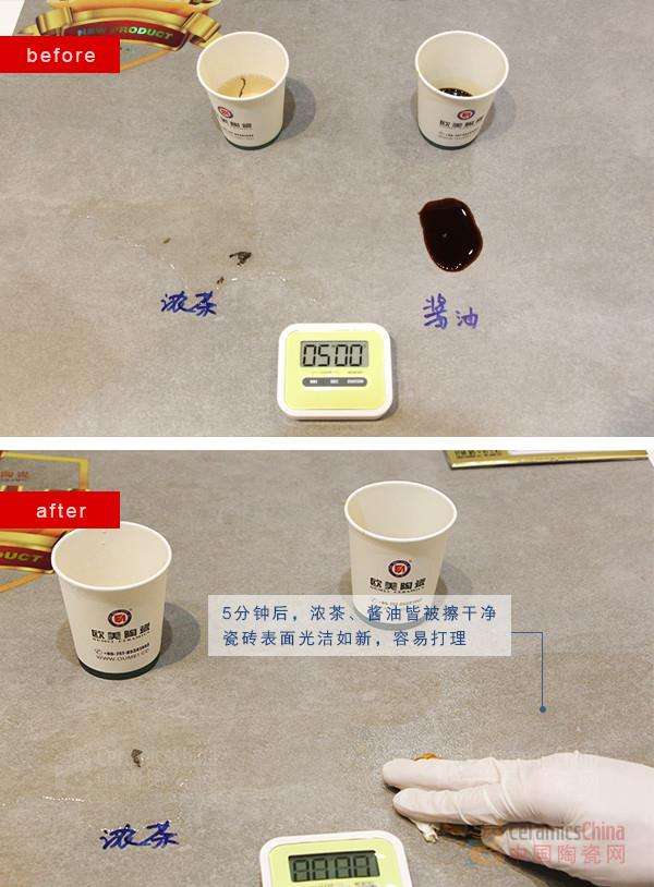 \u00A0 \u00A0 濃茶、醬油,作為人居環(huán)境經(jīng)常碰到的污漬來源,我們分別將其倒在凝灰印記系列瓷磚表面,檢驗產(chǎn)品的防污性能。面對這兩大困擾裝飾生活的“污染好手”,在靜置5分鐘后,測評人員將它們的濃稠液體拭去,污漬被抹布輕松擦走,瓷磚表面仍光潔如新。