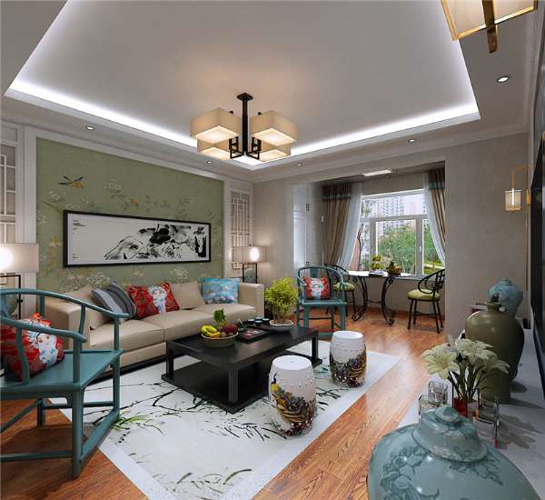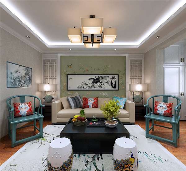 客廳,簡單的吊頂造型,顏色的搭配,白色、紅色、綠色、青綠色等的組合方式看起來使整個客廳更有活力。
