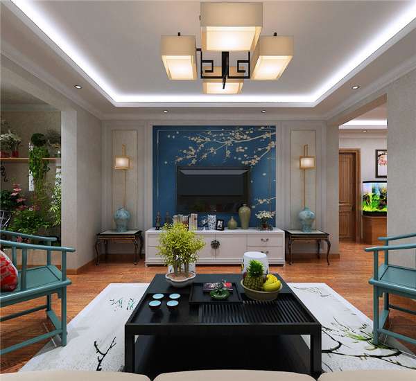 電視背景墻,同樣也是用了對稱的手法,而且與沙發(fā)背景墻相呼應(yīng),它的中間則貼的藍(lán)色的梅花壁紙,搭配白色的電視墻,整體看起來既現(xiàn)代又時尚又有中式的韻味~