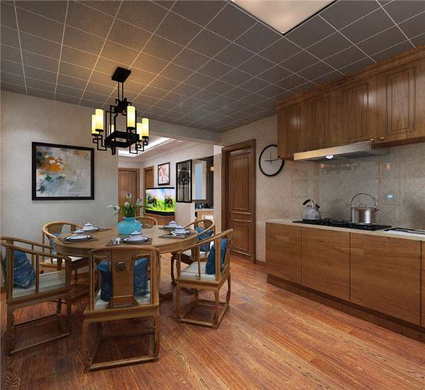 開放式的廚房,吊頂與餐廳做成一個整體,統(tǒng)一做成了集成吊頂~