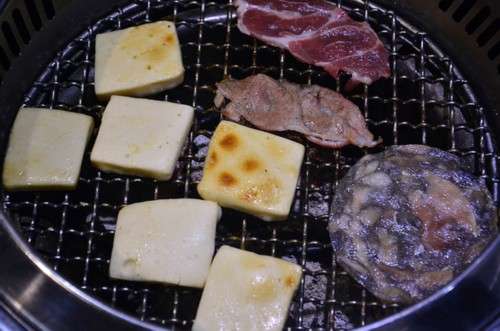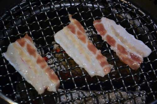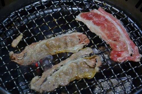 開始烤肉,爐子里面是燒紅的木炭,上面是一層金屬網(wǎng),烤肉就在網(wǎng)上烤,這樣油可以流下去,就不會(huì)吃到太多的油,比較健康。
