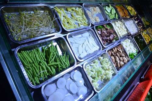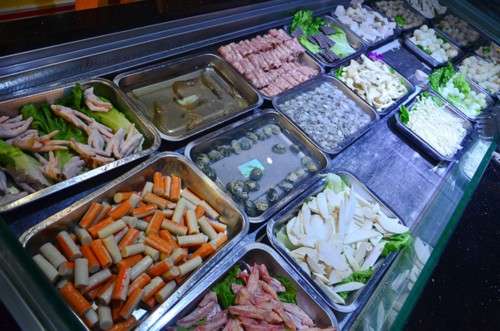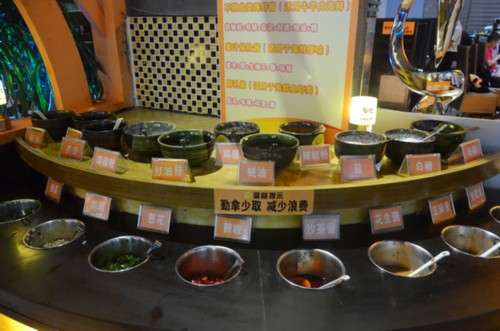 調(diào)料是自助的,品種挺多,可以按自己口味調(diào)制,墻上還貼心的寫著什么食材適合配什么醬。