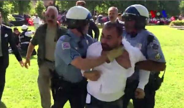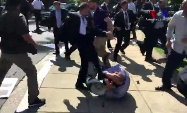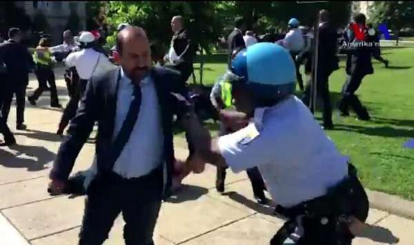 環(huán)球時(shí)報(bào)-環(huán)球網(wǎng)消息,當(dāng)?shù)貢r(shí)間2017年5月16日,美國華盛頓,示威者聚集在土耳其大使住宅外抗議,并與土耳其總統(tǒng)埃爾多安的保鏢發(fā)生激烈沖突,現(xiàn)場出現(xiàn)打架斗毆局面,穿西裝的男子對示威者進(jìn)行多次踢打,導(dǎo)致9人受傷,2人遭逮捕。據(jù)悉,當(dāng)日,土耳其總統(tǒng)埃爾多安到訪美國,與美國總統(tǒng)特朗普會面。