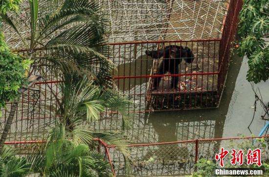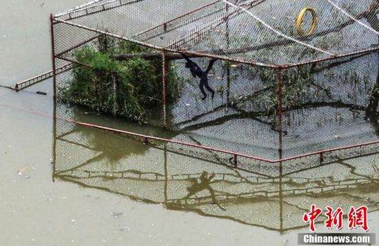 動(dòng)物園里的一只黑猩猩被洪水困在籠中一角。